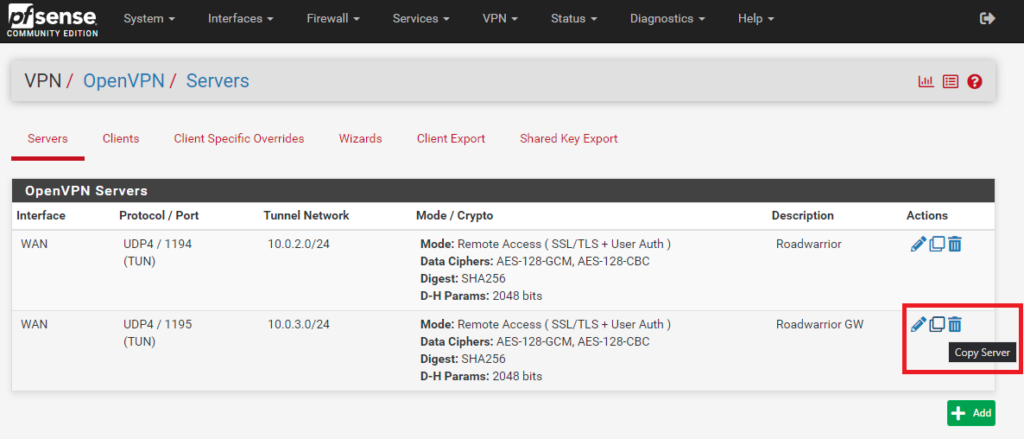 Da kein Risiko eingegangen werden sollte, die bestehenden Roadwarrior durch Konfigurationsänderungen irgendwie womöglich negativ zu beeinflussen wurde kurzerhand der vorhandene OpenVPN-Server kopiert. Bei pfSense ist das simple mit einem Mausklick rechts nebem dem Server zwischen “Editieren” und “Löschen” möglich: