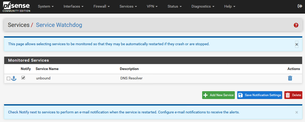 Wer keine ungetesteten Pakete einspielen möchte, kann sich dadurch behelfen, das die Erweiterung “Service-Watchdog” (Via “System – Package-Manager”) installiert und (unter “Services – Service Watchdog”) so eingerichtet wird das “unbound” automatisch neu gestartet wird: