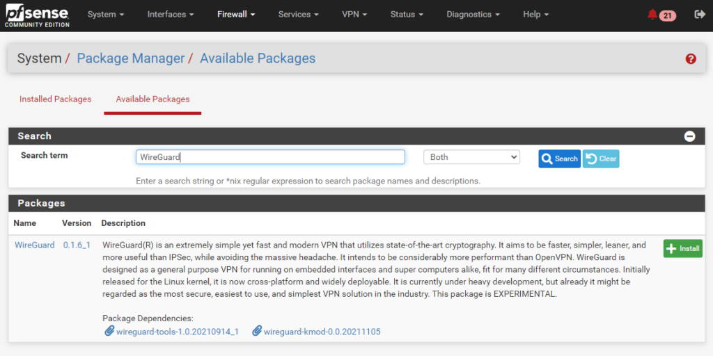 Unter “System – Package Manager – Available Packages” nach “WireGuard” suchen und das Paket installieren:
