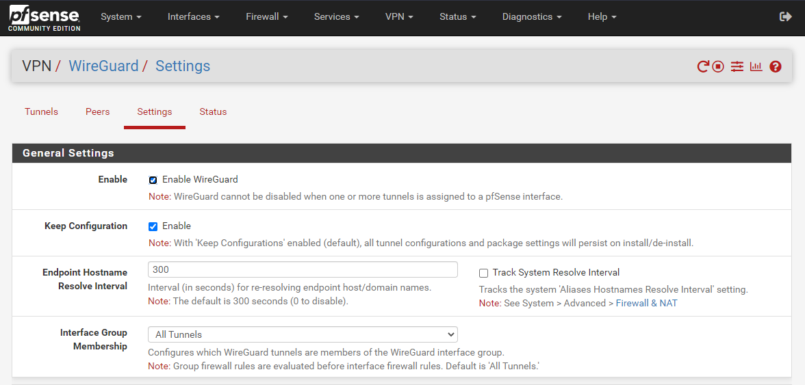 Damit sich Außendienst-Mitarbeiter, Home Office-Arbeitsplätze oder andere externe Personen oder Geräte Einwählen können, muss zunächst WireGuard unter “VPN – WireGuard – Settings” aktiviert werden: