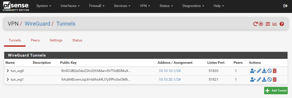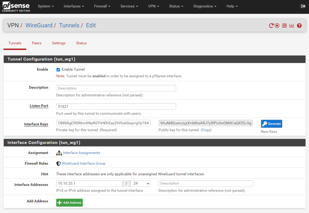 Als nächstes muss unter “VPN – WireGuard – Tunnels” ein Tunnel angelegt werden: