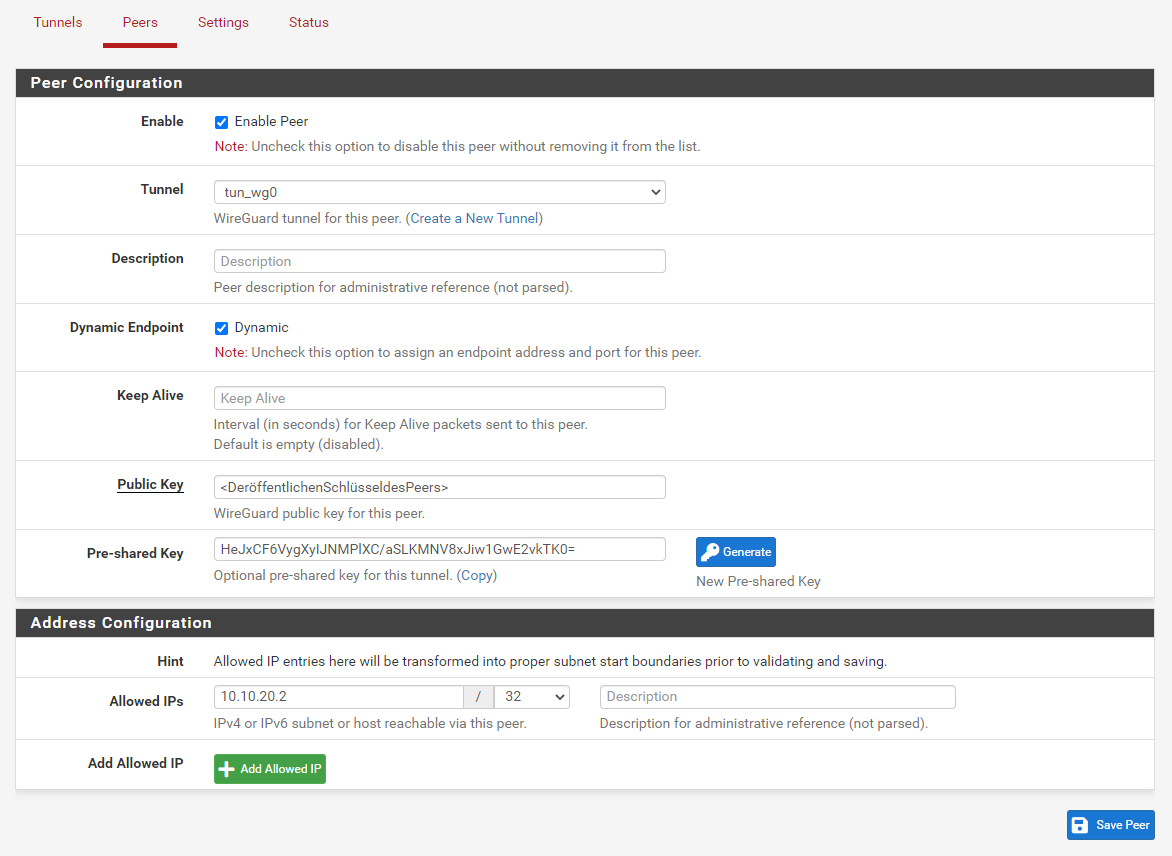 Wichtig: Für jedes Peer/jeden Client muss ein eigener PSK erzeugt werden! - Bei “Allowed IPs” die nächste freie IP-Adresse aus dem Transfer-Netz, z.B. “10.10.20.2/32”, eintragen.
