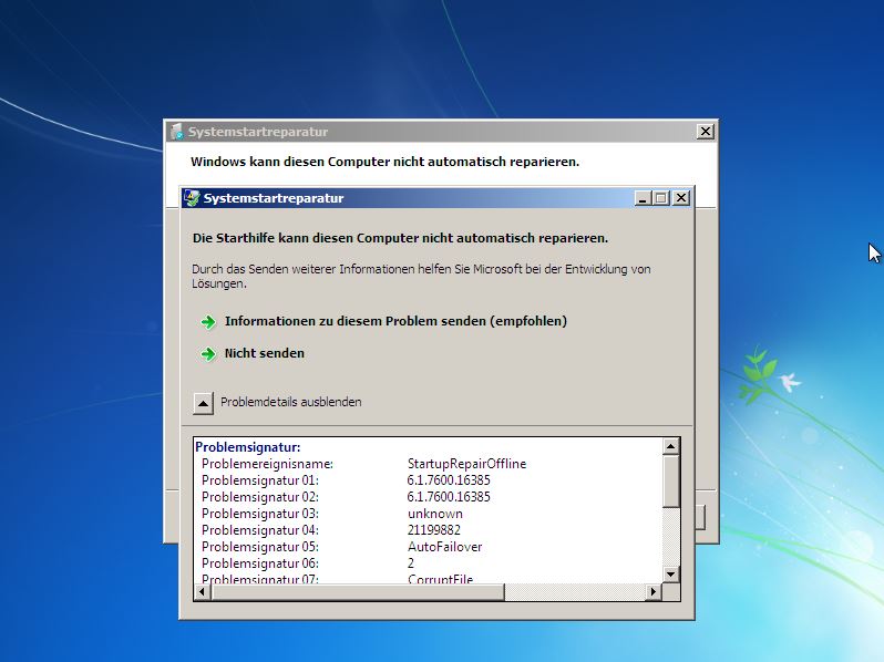 Es wird eine neue virtuelle Maschine mit Windows 7 Professional x64 inkl. SP1 mit SATA als Festplattenschnittstelle installiert. Nach erfolgreicher Installation wurden Microsoft Updates installiert. Nach dem Neustart bootet Windows nicht mehr bzw. bootet direkt in die Systemstartreparatur.