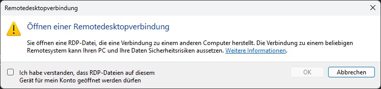 Vor den Updates konnte man eine *.rdp-Datei doppelt anklicken und die Verbindung wurde aufgebaut. Wobei das erst der Fall war, wenn man (initial) den Haken gesetzt hatte, das man den Remotecomputer kennt. Seit April erscheinen bei der Nutzung von *.rdp-Dateien folgende beide Meldungen hintereinander: