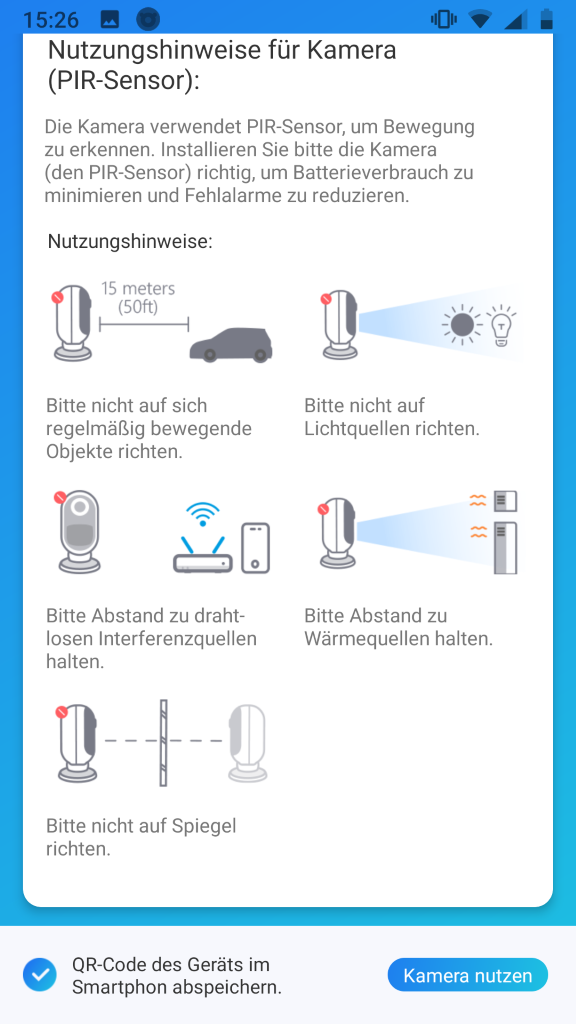 Direkt nach dem Einsetzen des Akkus ist die Kamera aktiv und weißt mittels englischer Ansprache daraufhin, das man mit der Smartphone-App fortfahren soll. Mit dieser scannt man den QR-Code der Kamera und wird mittels Assistent durch die Ersteinrichtung geführt. In der Hauptsache muss die WLAN-Verbindung und das Kennwort eingestellt werden.