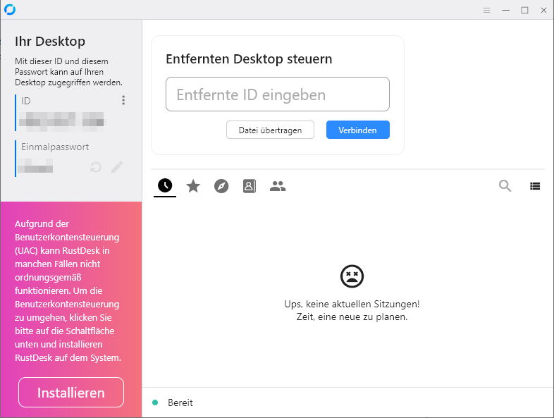 Im Gegensatz zu manch anderen Fernwartungslösungen gibt es bei RustDesk nur eine ausführbare Datei, die sowohl für die spontane Ausführung als auch für eine Installation verwendet werden kann. Daraus ergibt sich, das man zunächst die aktuelle RustDesk.exe herunterlädt und ausführt, anschließend klickt man links unten auf “Installieren”: