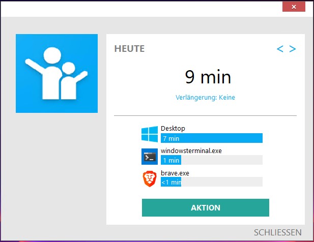 Im Infobereich (rechts unten neben der Uhr, ist ggf. ausgeblendet, findet sich das Symbol der Salfeld Kindersicherung. Klickt man dieses an, sieht man aktuelle Infos wie Nutzungszeit und kann Aktionen, wie zum Beispiel die Zeit verlängern, durchführen.