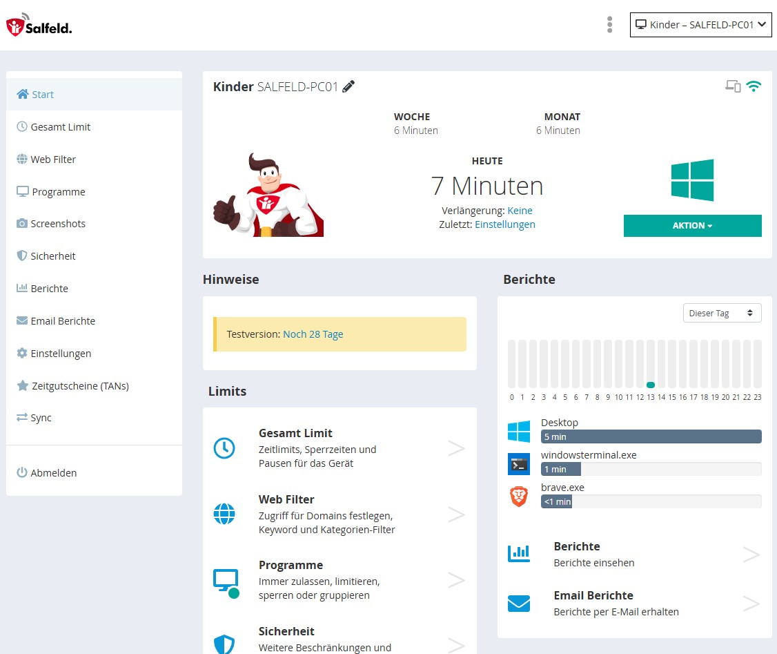 Die generelle Verwaltung der Geräte und Einstellungen findet über ein Web-Portal statt. Dies bietet den Vorteil, das es von überall aus genutzt werden kann und keine “Verwalter-Software” installiert werden muss. Wer möchte kann die Eltern-App für Android (kostenlos) installieren um so schnell und einfach Einstellungen ändern zu können. An dieser Stelle sei erwähnt, das die Salfeld GmbH ein deutsches Unternehmen ist und bereits seit 1998 existiert. Es gibt also nicht nur bereits eine Jahrzehnte lange Firmenhistorie speziell in Sachen Kindersicherungs-Software, sondern es gilt zudem Deutsches Rechts sowie die DSGVO wenn es um den Datenschutz geht.