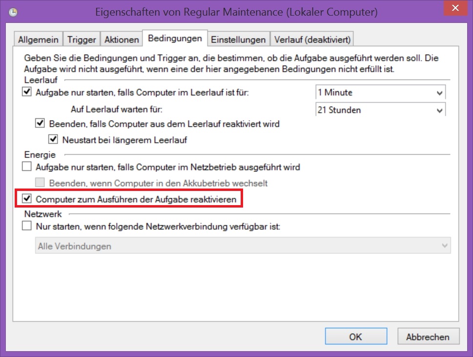 Der potentiell einfachste Weg besteht darin, schlicht der Aufgabe die Option zum reaktivieren des Computers zu entziehen. Damit das erfolgreich möglich ist, sind zwei Dinge zu beachten: