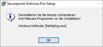 Installiert man Securepoint’s Antivirus Pro erhält man sofern ein anderer Virenschutz installiert ist eine Meldung über dessen Vorhandensein.