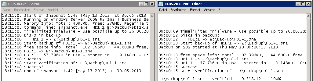 Jedenfalls kommt der Fehler schlicht dadurch zustande, wie das Log geschrieben wird. Wie eingangs erwähnt hat man zwei Möglichkeiten, den Parameter “–LogFile:” oder die Umleitung (Pipe). Und da ist der Haken: Wird “–LogFile:” verwendet, beginnen die Logs bzw. die Einträge des jeweiligen Backup-Vorgangs mit “start of snapshot”, bei der Umleitung nicht. Kurz gesagt, diese vier Zeilen fehlen bei der Umleitung: