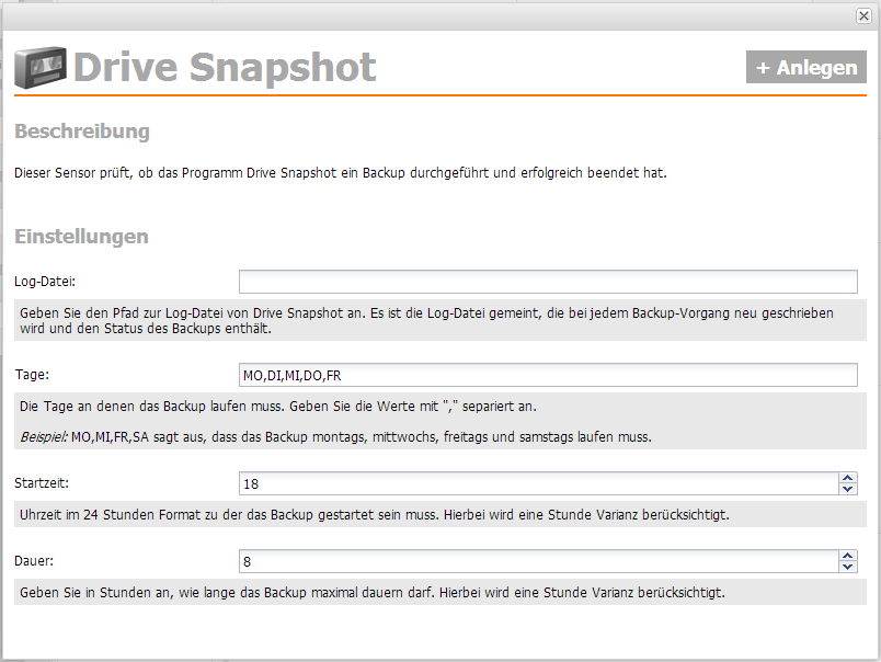 Der Sensor findet sich in der Kategorie “Backup”. Beim Anlegen des Sensors wird man nach dem Pfad und dem Dateinamen des Logs gefragt, an welchen Tagen und zu welcher Uhrzeit das Backup laufen sollte. Auch die maximale Dauer kann angegeben werden. Letzteres kann Hinweise darauf liefern, ob mit der Performance des zu sichernden Systems oder des Ziels etwas nicht stimmt oder ungewöhnlich viele Daten hinzugekommen sind.