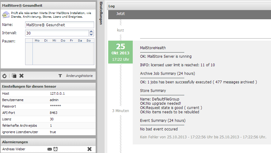 Der Hersteller des MailStore Servers bietet selbst keine Möglichkeit an, den Status der E-Mail-Archivierung aus der Ferne oder automatisiert zu überwachen. Zwar kann man mit Hilfe des MailStore-Clients und den entsprechenden Berechtigungen sehen, ob die Aufgabe erfolgreich war, ggf. kann man auch auf die Protokolle zugreifen, ein Monitoring mit Alarmierung ist allerdings mit Bordmitteln nicht möglich.