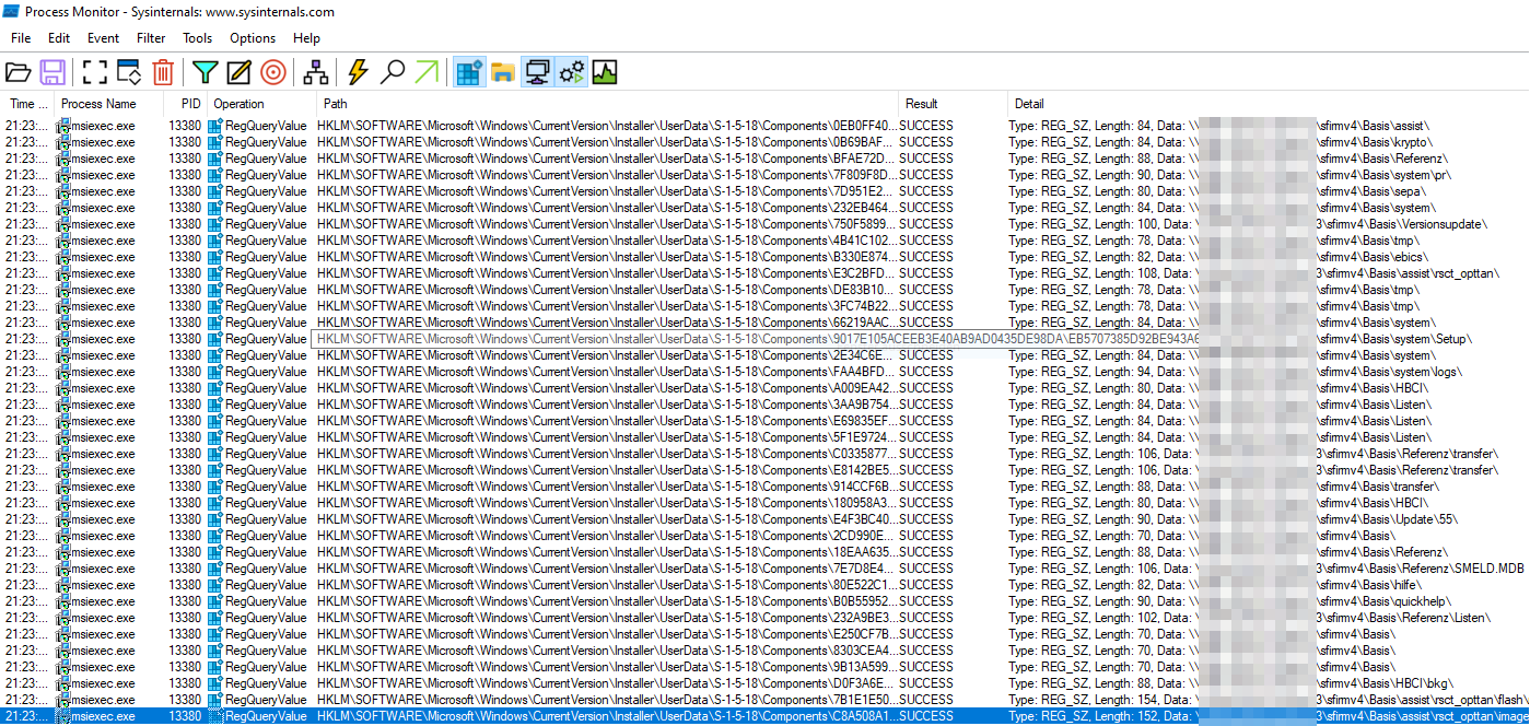 Das Ergebnis wurde dann mit dem alten Servernamen (“Detail contains <ALTERSERVER>”) gefiltert. So fanden sich 37 Treffer, offenbar von diversen via MSI installierten Komponenten, die auf unterschiedliche Unterordner (auf den alten Server) verwiesen: