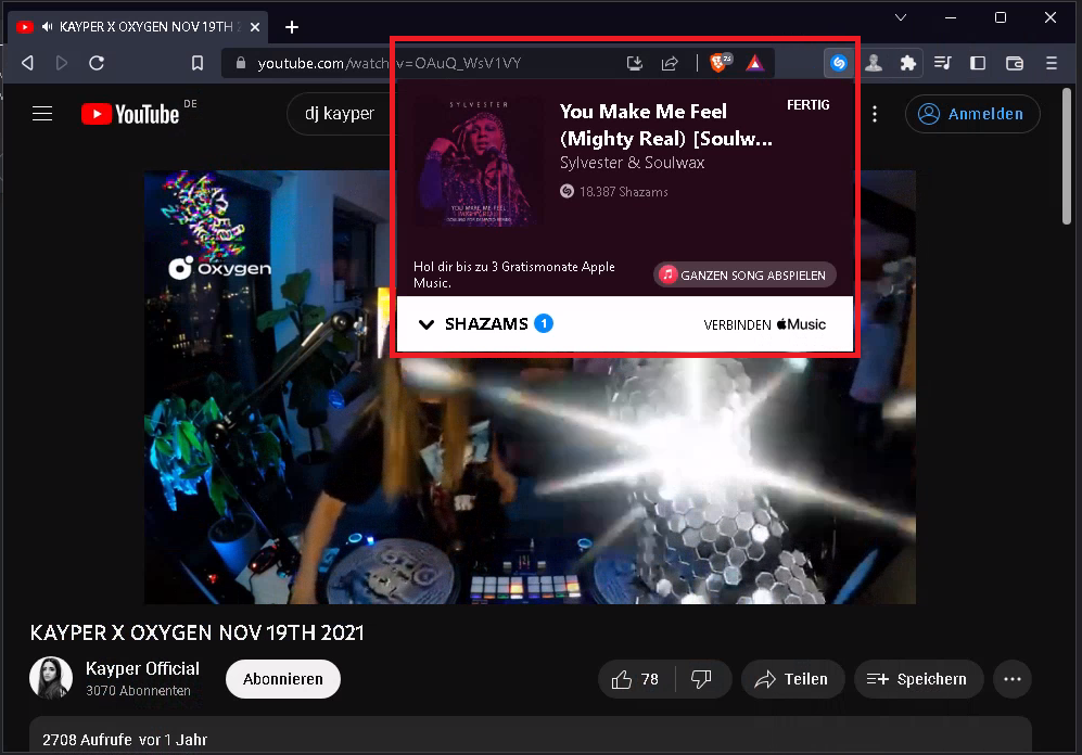 Von nun an kann man bei Bedarf z.B. bei YouTube, Mixcloud und Co. Shazam erkennen lassen, was da gerade läuft. Die Erweiterung wird erst aktiv, wenn man das Symbol angeklickt hat.