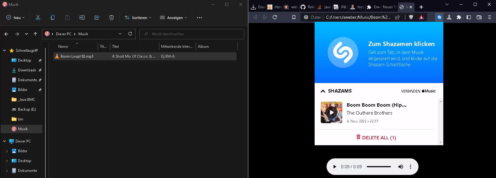 Hier wurde in einen neuen (leeren) Tab im Brave Browser auf der rechten Seite die Musik-Datei (von links) hineingeschoben, die Wiedergabe gestartet und Shazam ausgeführt. Im Idealfall wird das Musikstück sofort erkannt. Wenn es etwas schwieriger, weil zum Beispiel unbekannter, wird dauert es auch schon mal etwas länger. In diesem Fall ist die “HipHop Long” Version von “The Outhere Brothers – Boom Boom Boom” eher wenig verbreitet und folglich kaum bekannt, wurde aber dennoch richtig identifiziert. 90er Jahre Kids wie ich erinnern sich, dass das Original eine Eurodance/Hip House-Nummer ist.
