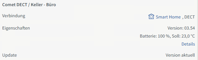 Das ist nun nicht weiter tragisch, denn entwender unter “Heimnetz – Smart Home” oder nach einem Klick auf “Details” bekommt man die aktuelle Temperatur. So nebenbei bemerkt: In der FRITZ!App hingeben wird die gemessene Temperatur angezeigt.