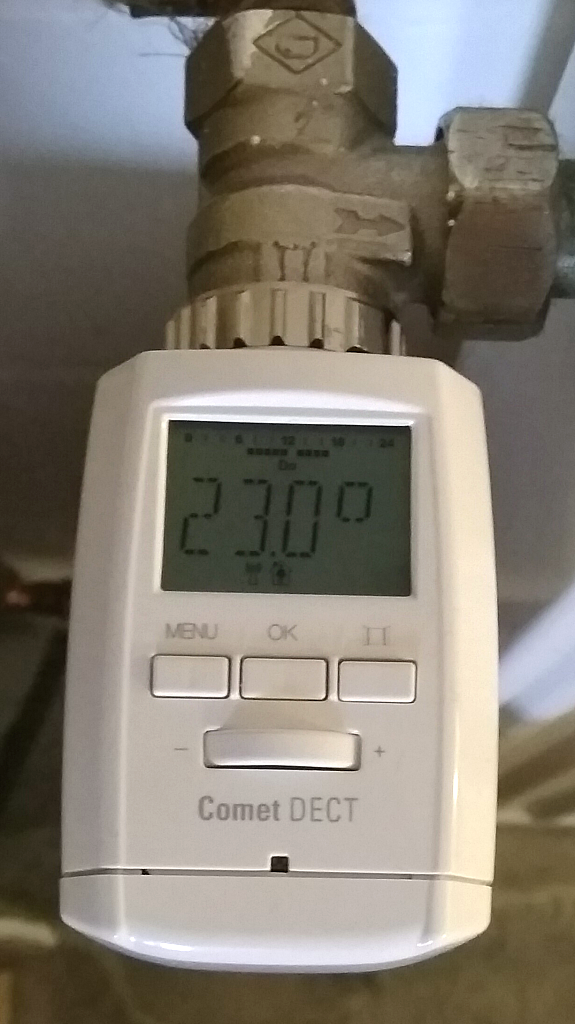 So langsam zieht das Thema Smart Home bei uns ein. So wurde bereits im Sommer ein AVM FRITZ!DECT 210 im Außenbereich installiert, um saisonabhängig verschiedene Dinge, im Moment hängt die Weihnachtsbeleuchtung dran, zu schalten. Nun kam passend zur Heizperiode ein Comet DECT Heizkörperregler hinzu.