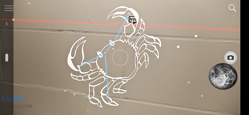 SkyView Free nutzt dabei Augmented Reality und blendet im Live Bild der Kamera die Sternen-Positionen ein. Das klappt bei Tag wie Nacht und selbst dann, wenn man wie im Bild an eine Kellerwand schaut: