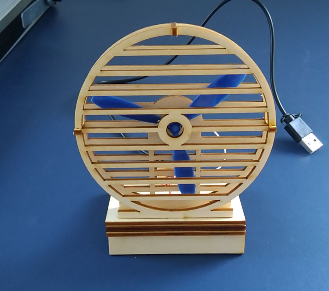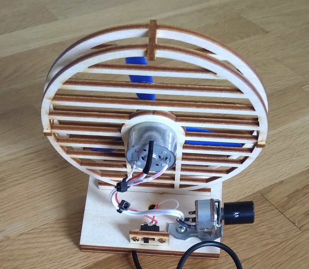 Zum Festschrauben des Schalters und des Motors wird ein kleiner Schlitzschraubendreher als auch ein Spitzzwange zum Festhalten der Muttern beim Schalter benötigt. Gelötet werden muss lediglich das USB-Kabel sowohl an den Schalter als auch den Motor. Lange Rede, hier ein Bild vom fertigen Ventilator: