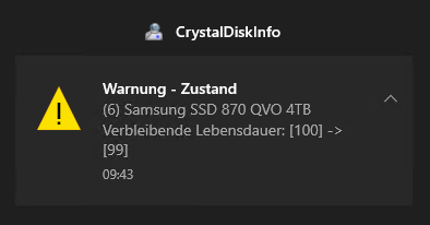 Hier mal Beispiele von SSDs, einmal direkt in CrystalDiskInfo und einmal eine Benachrichtigung das sich der Zustand verändert hat: