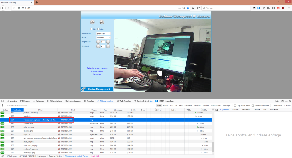 Etwas schwieriger war es mit der Kamera von velleman. Da bei diesem Modell der eigentliche Hersteller nicht bekannt ist, wurde kurz und knapp mittels “Web-Entwickler – Netzwerkanalyse” des Firefox die richtige Zeile ermittelt: