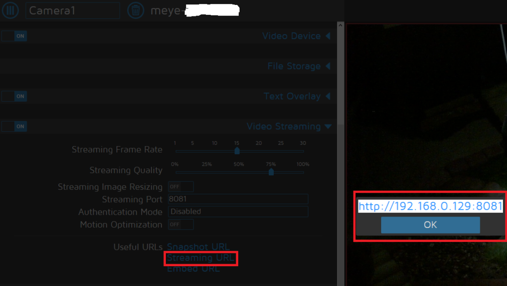 Bei MotionEye war es kein Problem, die Adresse des Streams zu bekommen. Diese wird einfach unter “Video Streaming – Streaming URL” nach einem Klick vorausgewählt zum Kopieren angeboten: