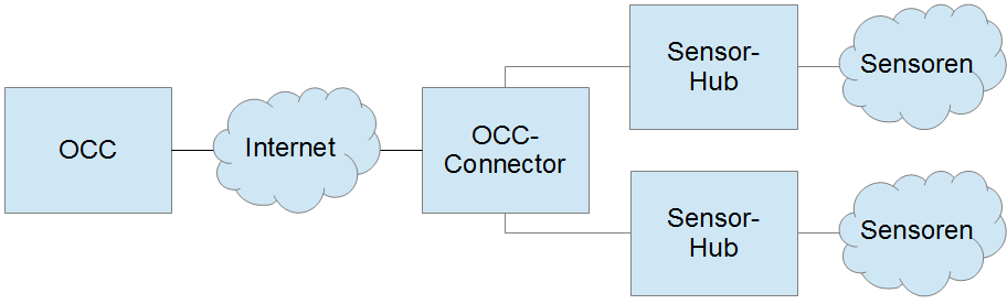 Damit ein Kundensystem bzw. -Netzwerk überwacht werden kann, ist es notwendig, den OCC Connector zu installieren. Pro Netzwerk ist ein OCC Connector notwendig. Dieser kommuniziert über das Internet via SSL-gesicherter Verbindung mit dem OnlineControlCenter, kurz OCC. Der Computer auf dem der OCC Connector installiert ist, ist damit der Einzige, der mit dem Internet verbunden sein muss. Alle anderen Systeme mit ihren dort installierten Sensorhubs und Sensoren kommunizieren mit bzw. über den OCC Connector.