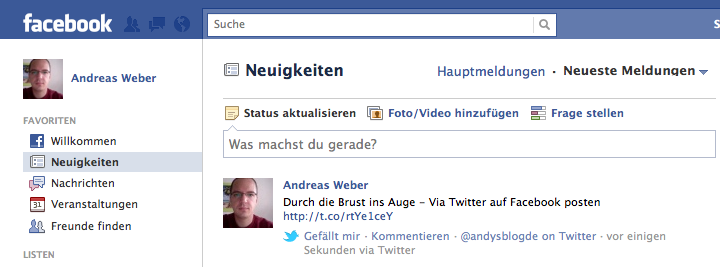 Gut, lange Rede, kurzer Sinn. Via Twitter gibt es die Möglichkeit, seine Tweets auf die Pinnwand von Facebook zu bringen. Das ironische daran ist: Auch das funktioniert letztlich über eine Facebook-App. Die installiert sich allerdings ohne grossartiges manuelles zutun.
