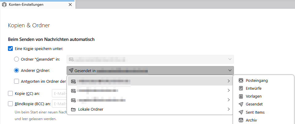 Ein Blick in die “Konten-Einstellungen” auf “Kopien & Ordner” des betroffenen Postfachs zeigte nichts ungewöhnliches. Per Default steht dort bei “Beim Senden von Nachrichten automatisch” das zum einen die Option “Eine Kopie speichern unten” aktiv ist und bei ‘Ordner “Gesendet” in:’ ist die entsprechende E-Mail-Adresse des Postfachs ausgewählt.