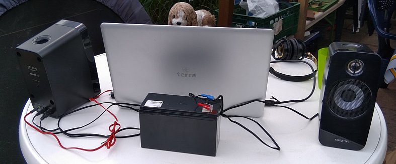 Swissonic MM-3 mit Bleiakku funktioniert auch. Da hat man mehr Dampf zur Verfügung als mit den Creative PC-Lautsprechern von obigen Bild.