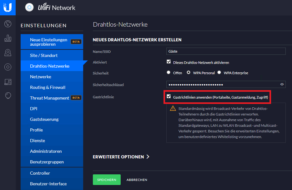 Nach einem Klick auf “Speichern” das das Netzwerk bereits aktiv und kann genutzt werden. Weitere Konfigurationsmöglichketen für die Gastrichtlinien findet man unter