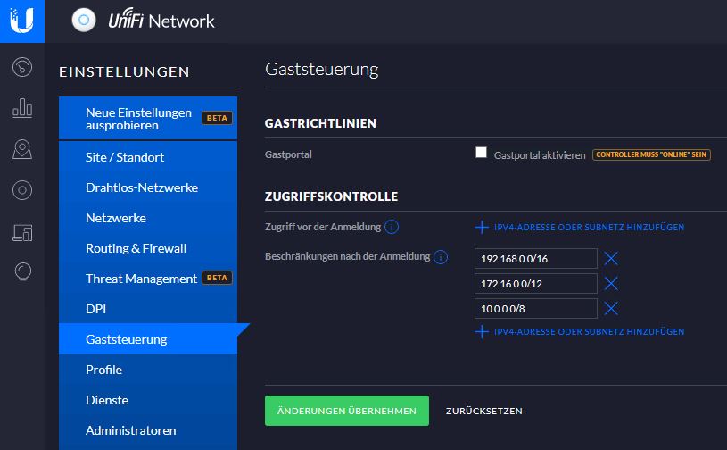 Das System regelt mit der Gastrichtlinie/Gaststeuerung, das der Client nur mit dem Router (muss nicht von Ubiquiti sein) zwecks Internet “reden” kann. In wie weit der Client auf andere Ressourcen zugreifen kann ist Sache der Zugriffskontrolle (zugelassene/gesperrte Hosts/Netze, “Quasi”-Firewall).