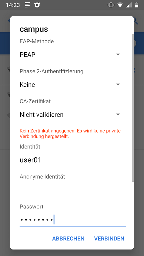 – Bei der Konfiguration von PEAP das zuvor importierte Zertifikat auswählen.