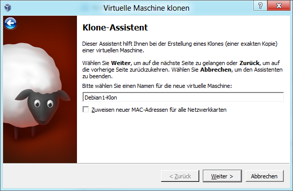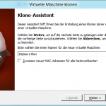 - Einen Namen für den Klon vergeben und ggf. die Option “Zuweisen neuer MAC-Adressen für alle Netzwerkkarten” aktivieren. Die MAC-Adresse(n) können auch nachträglich geändert werden. Man sollte aber auf jeden Fall darauf achten, das man nicht gleichzeitig zwei oder mehr virtuelle Maschinen mit der gleichen MAC-Adresse aktiv im Netzwerk laufen lässt.