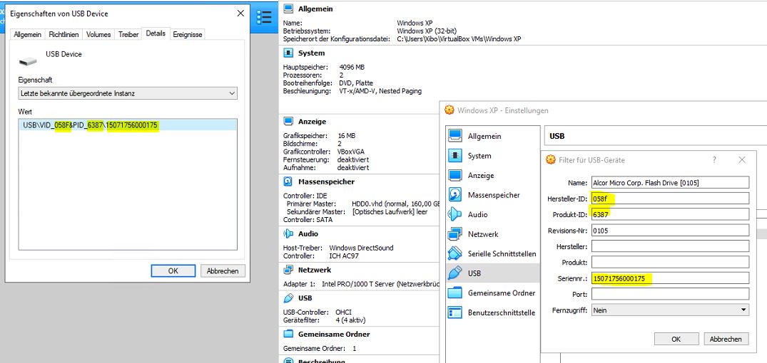 Lösen liese sich das Ganze letztlich durch das manuelle Anlegen eines USB-Filters in den Einstellungen der virtuellen Maschine. Ich schaute mir dazu zunächst die Einstellungen eines funktionierenden USB-Geräts an: