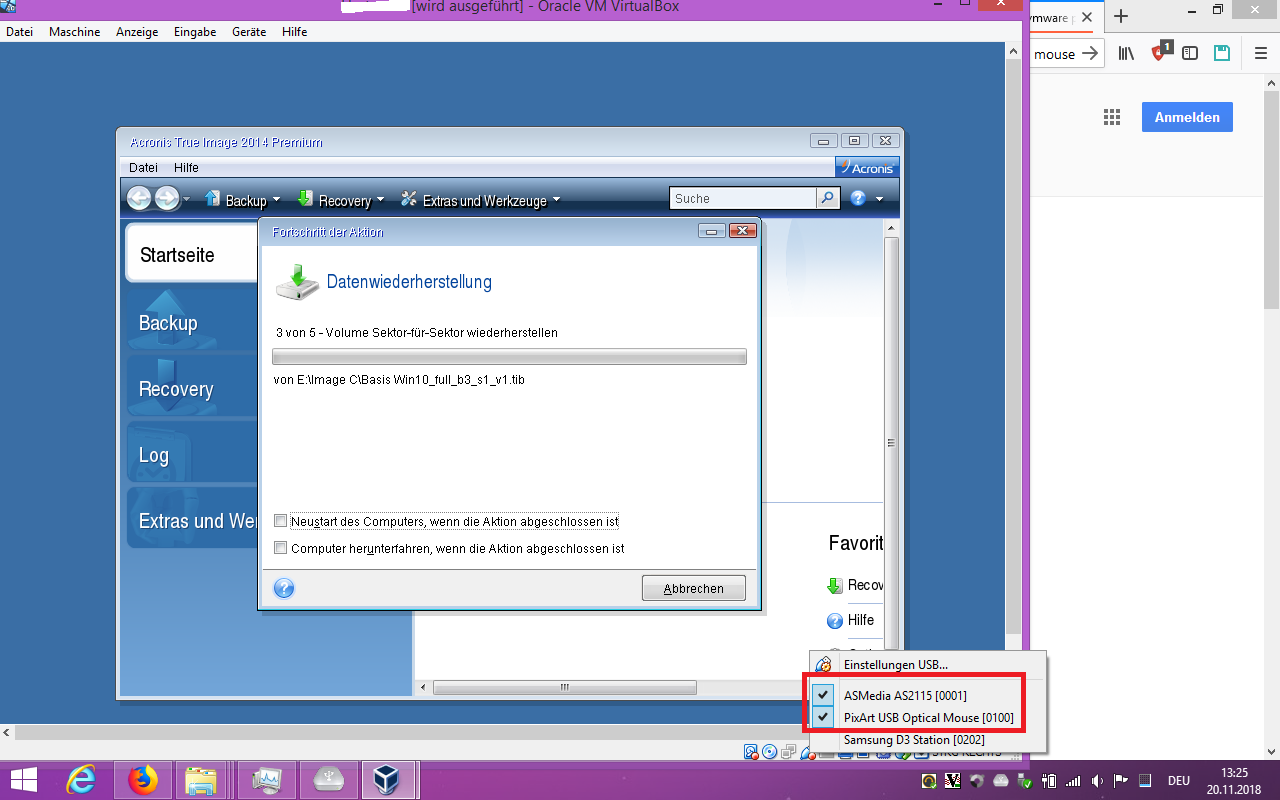 - Das Rettungsmedium startet nicht, sobald eine USB-Festplatte an die VM weitergeleitet wird. Abhilfe schafft, diese erst nach dem erfolgreichen Bootvorgang weiterzuleiten.
