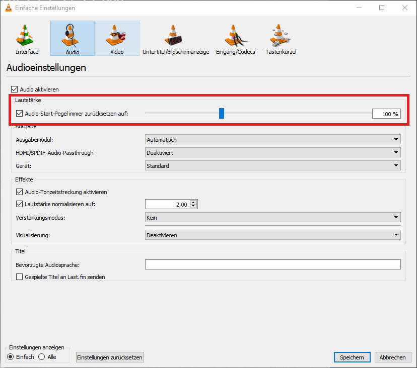 Beim Start des Players lässt sich ein Wert für die Lautstärke vorgeben. Dies ist hilfreich um einen gewünschten Pegel von vornherein zu erhalten oder alternativ wieder z.B. auf 100% zurückzusetzen: