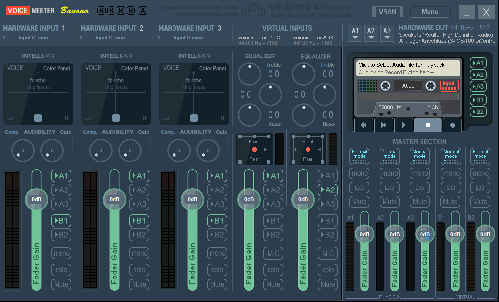 Zunächst Voicemeeter Banana starten. Die beiden zu verwendeten Soundkarte bei “A1” und “A2” auswählen.