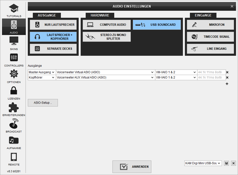Als Alternative zu ASIO4ALL kann man das Ungleich mächtigere Voicemeeter verwenden. Anbei mit einer Onboard- sowie USB-Soundkarte in Verbindung mit VirtualDJ ein Konfigurationsbeispiel.