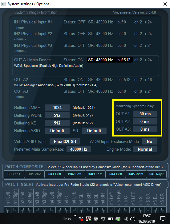 Verwendet man zwei unterschiedliche Soundkarten kann es trotz identischer Einstellungen Latenzunterschiede geben. Das mag an den Treibern und der Hardware liegen. Eine mögliche Abhilfe kann sein, das “Monitoring Synchro Delay” in Voicemeeter zu konfigurieren: