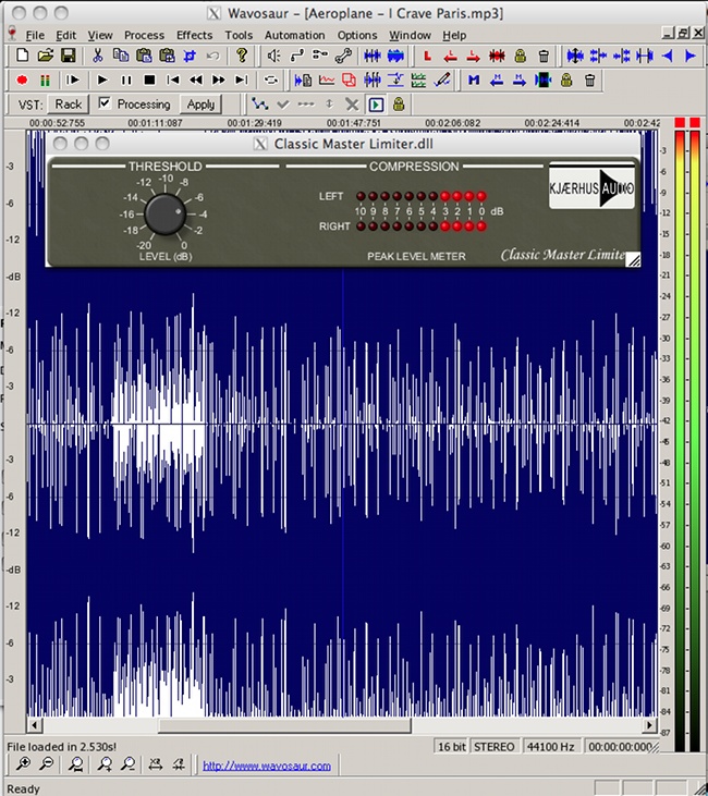 Und so sieht Wavosaur unter Mac OS X mit dem Classic Master Limiter von Kjaerhus aus: