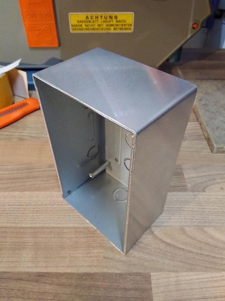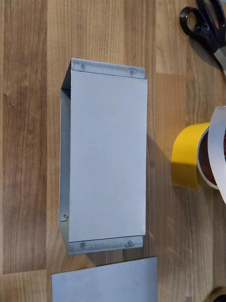 Da es das Gehäuse scheinbar nicht einzeln gibt, zumindest konnte ich keines finden, musste Abhilfe geschaffen werden. Ursprünglich wollte ich es einfach irgendwie verschließen, zum Glück hatte meine Frau dann aber die Idee ein Blech drum herum zu Biegen. Also mal in der Werkstatt umgeschaut und ja ein wenig Alu-/Bastelblech (gibt’s im Baumarkt) das gerade so ausreichen könnte ist da.