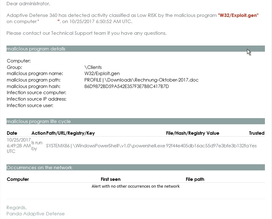 Kurzfassung: Es kam eine Mail mit einer vermeintlichen Rechnung als Word-Datei, diese wurde gespeichert und geöffnet, ein Makro wollte via PowerShell einen (oder mehrere) Schädlinge herunterladen und ausführen. Panda Griff an dieser Stelle, so das nichts heruntergeladen wurde und in Folge auch nichts weiter geschehen ist.