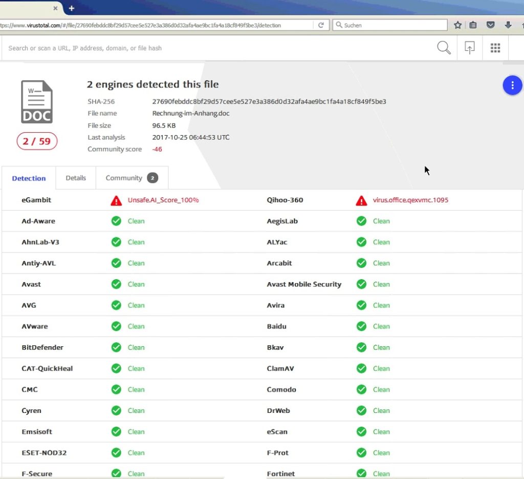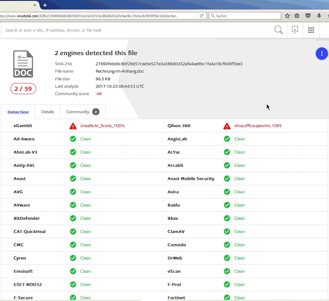 Wie man sieht, würde dieses “Ding” bei fast allen Virenscannern durchgehen. Ziemlich ernüchterndes Ergebnis also. In diesem Fall hies die Datei übrigens “Rechnung-Oktober-2017.doc”. Mittlerweile finden sich auch andere Dateinamen im VirusTotal-Ergebnis, ferner steigen die Community-Beiträge in denen z.B. die Malware-URLs angegeben sind: