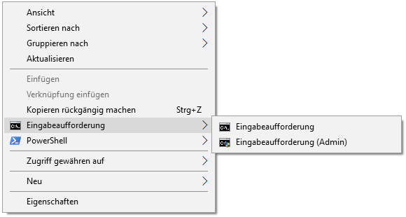 Nachdem die “cmd-powershell.reg” importiert wurde, findet man im Kontextmenü sowohl die gute alte Eingabeaufforderung als auch die PowerShell, beides sogar sowohl für den aktuell angemeldetene Benutzer als auch mit erhöhten Rechten (Admin):