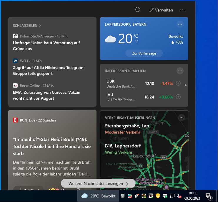 Mit dem Juni’21-Patchday, genauer ausgedrückt mit dem Update KB5003637, beschert Microsoft dem Anwender so ganz nebenbei und völlig ungefragt eine Neuerung in der Taskleiste, denn dort wird auf einmal das Wetter angezeigt: