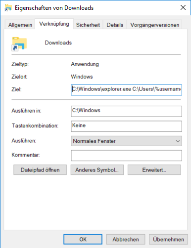 - Ziel: C:\Windows\explorer.exe C:\Users\%username%\Downloads