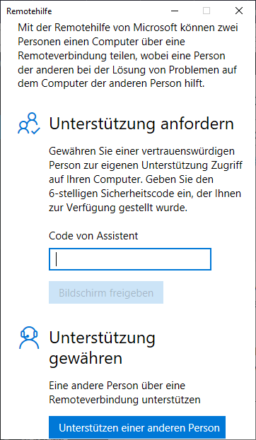 Der Supporter muss auf “Unterstützen einer anderen Person” klicken um einen Code zu generieren. Auf der Gegenseite, also beim Hilfesuchenden, muss dieser Code dann eingeben und der Zugriff bestätigt werden. Danach wird der Bildschirm geteilt und man kann den entfernten Computer steuern oder Anmerkungen machen.
