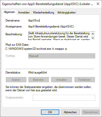 Startmenü und Co. liefen da immer noch nicht. Nebenbei bemerkt: Nicht nur mit meinem Benutzerkonto gab es die genannten Schwierigkeiten, sondern auch mit anderen. Daraus ergab sich, das es etwas generelles sein musste. Via Task-Manager fiel auf, das die CPU durch einen Dienst ordentlich beansprucht wird, durch den Process Explorer und die Diensteverwaltung konnte “AppX-Bereitstellungsdienst (AppXSVC)” ermittelt werden: